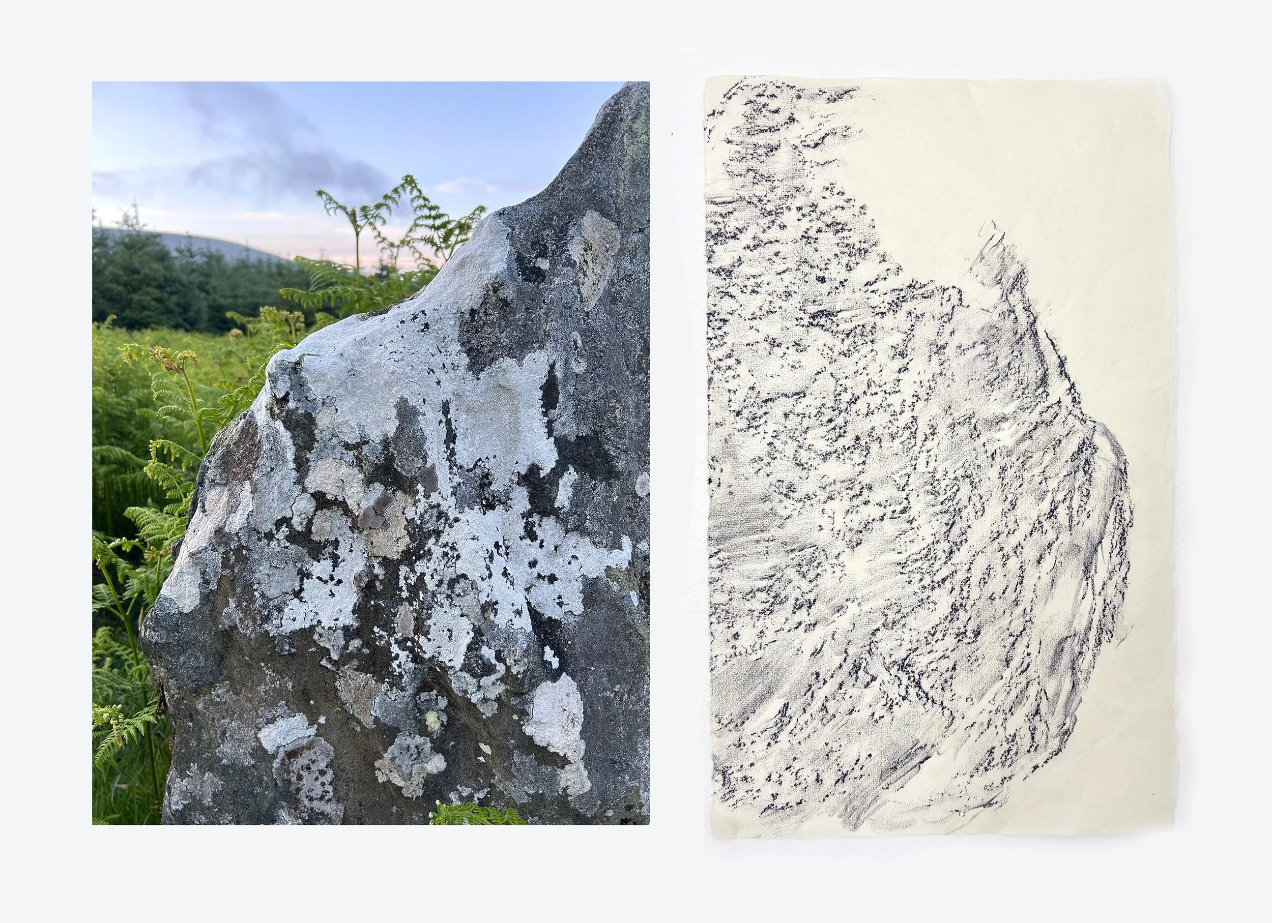 Recently, I have been working with rubbings, prompted in part by the presence of a Neolithic stone circle in the forest behind my home. I have been researching it for some time, searching for a way to respond to it through my work. Once composed of twenty stones, the circle now holds only eleven. I find myself thinking about the nine that are missing, and about the Neolithic people who lifted and positioned these immense weights with such precision that they align with the summer solstice. They were people deeply connected to the land, people who understood it intimately, depended upon it, and cared for it.