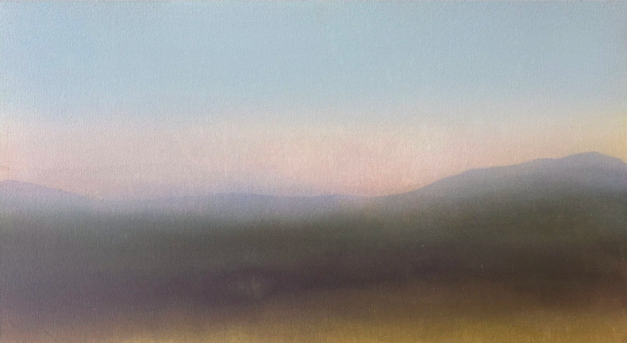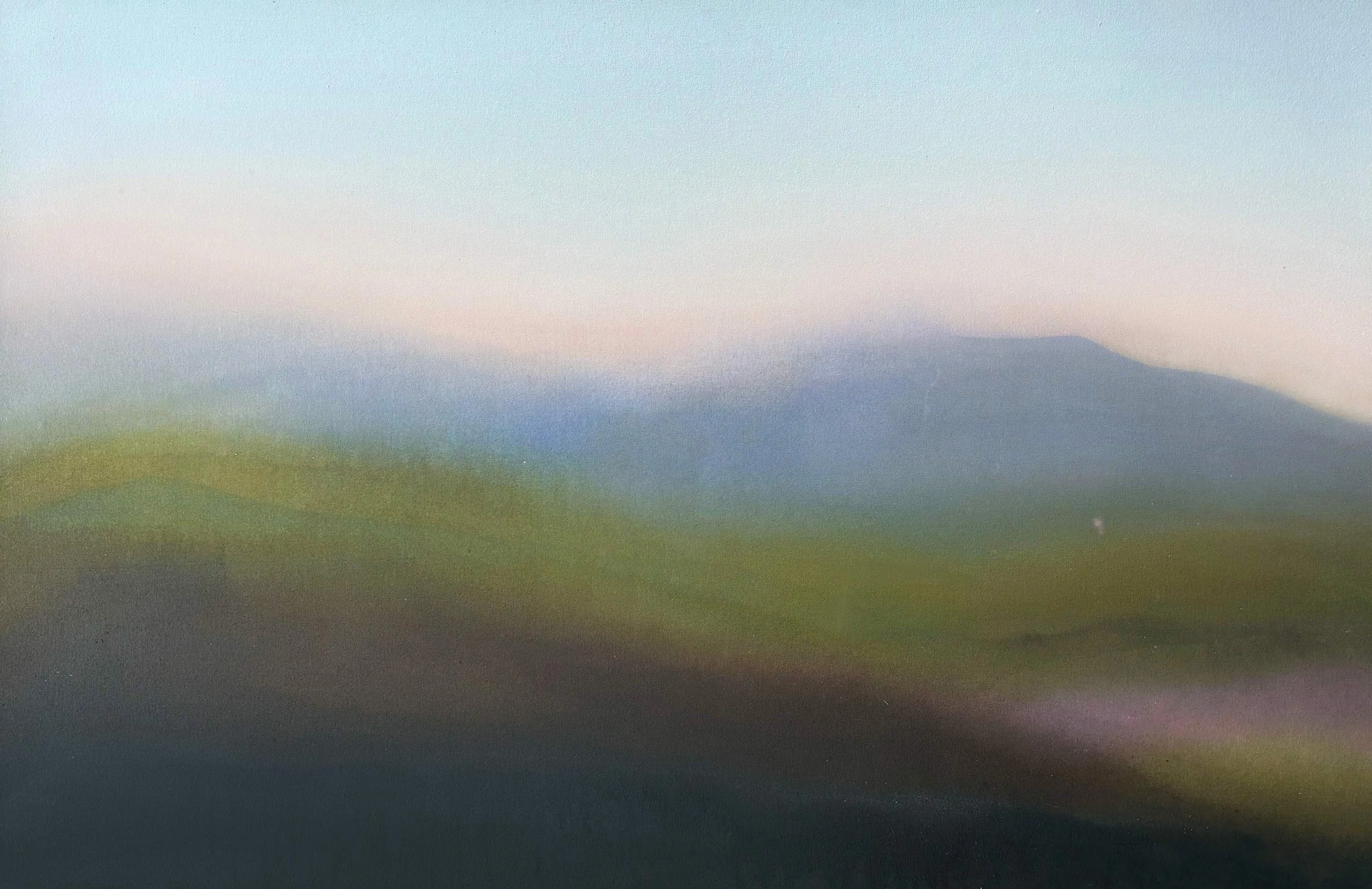 My paintings are not made from photographs, nor do I bring canvases out to paint directly from observation. They emerge from long periods spent traversing and exploring the landscape around me. When I am in the mountains or on forest trails, running, jogging, walking, I absorb the colours, the feel of the air on my skin, the smells and the atmosphere. Through osmosis, it settles somewhere inside me. The work that emerges is not about representing a specific mountain or place. It’s about the embodied experience of many natural spaces.